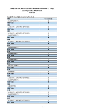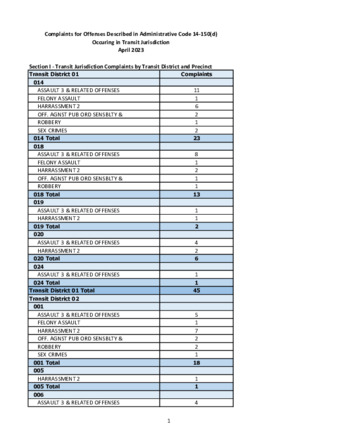 Pursuant to Admin Code Sect. 14-150(d), this monthly report contains information on complaints and arrests for violent felony offenses, assault, sex offenses, disorderly conduct, harassment, aggravated harassment, and offenses against public sensibilities that occurred in transit