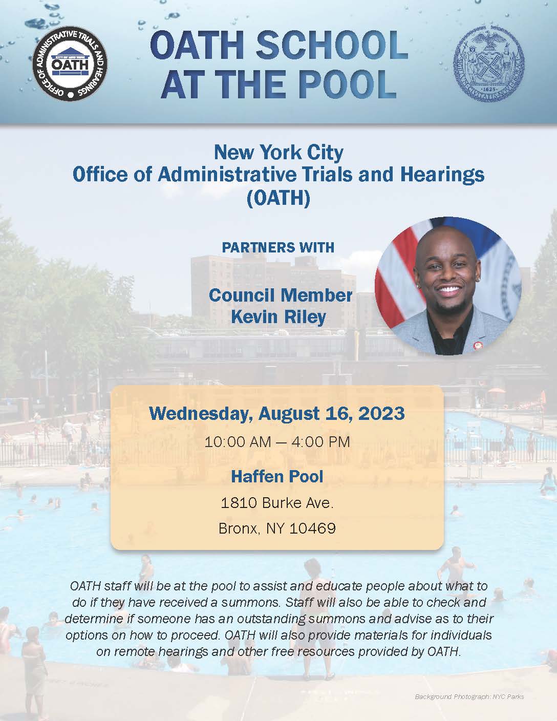 OATH staff were at the pool to assist and educate people about what to do should they have received a summons and to check to determine if someone has an outstanding summons. Materials about remote hearings and other free resources were provided to the public as well.