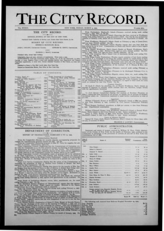 The City Record newspaper publishes notices which includes but is not limited to: public hearings and meetings, public auctions and sales, solicitations and awards and official rules proposed and adopted by city agencies. This is the City Record Newspaper for March 03, 1905.