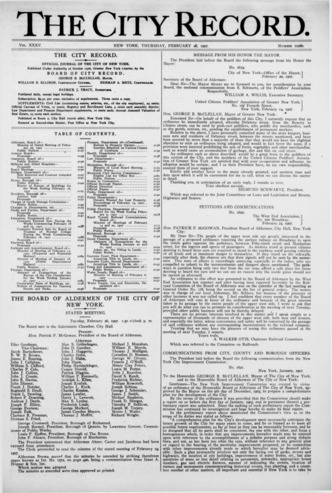 The City Record newspaper publishes notices which includes but is not limited to: public hearings and meetings, public auctions and sales, solicitations and awards and official rules proposed and adopted by city agencies. This is the City Record Newspaper for February 28, 1907.