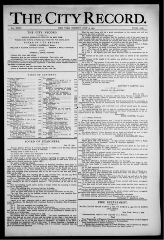 The City Record newspaper publishes notices which includes but is not limited to: public hearings and meetings, public auctions and sales, solicitations and awards and official rules proposed and adopted by city agencies. This is the City Record Newspaper for July 09, 1907.