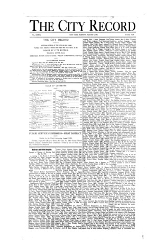 The City Record newspaper publishes notices which includes but is not limited to: public hearings and meetings, public auctions and sales, solicitations and awards and official rules proposed and adopted by city agencies. This is the City Record Newspaper for August 08, 1911.