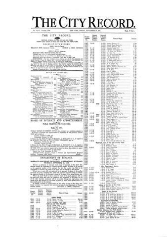 The City Record newspaper publishes notices which includes but is not limited to: public hearings and meetings, public auctions and sales, solicitations and awards and official rules proposed and adopted by city agencies. This is the City Record Newspaper for September 27, 1918.