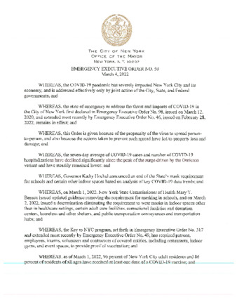 Emergency Executive Order No. 50 extends Emergency Executive Order No. 49, dated February 28, 2022, for 2 days, and extends Emergency Executive Order No. 46, dated February 28, 2022, for 5 days. Both are related to the City's response to the COVID 19 pandemic.