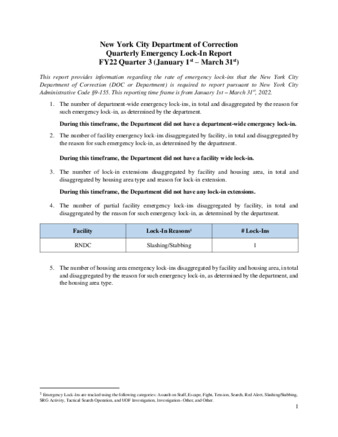 Pursuant to the local law this report provides information related to on emergency lock-ins within city jail facilities, including the number of lock-ins, duration of lock-ins, and programming and service interruptions.