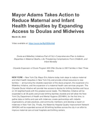 Mayor Adams Takes Action to Reduce Maternal and Infant Health Inequities by Expanding Access to Doulas and Midwives