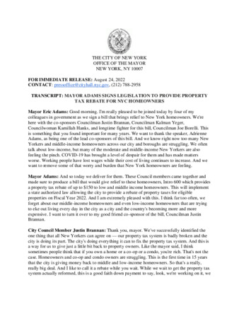 TRANSCRIPT: MAYOR ADAMS SIGNS LEGISLATION TO PROVIDE PROPERTY TAX REBATE FOR NYC HOMEOWNERS