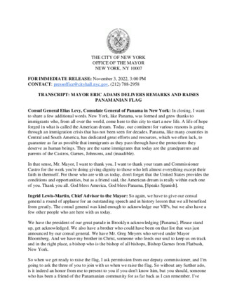 TRANSCRIPT: MAYOR ERIC ADAMS DELIVERS REMARKS AND RAISES PANAMANIAN FLAG