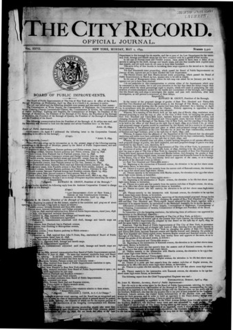 The City Record newspaper publishes notices which includes but is not limited to: public hearings and meetings, public auctions and sales, solicitations and awards and official rules proposed and adopted by city agencies. This is the City Record Newspaper for May 01, 1899.