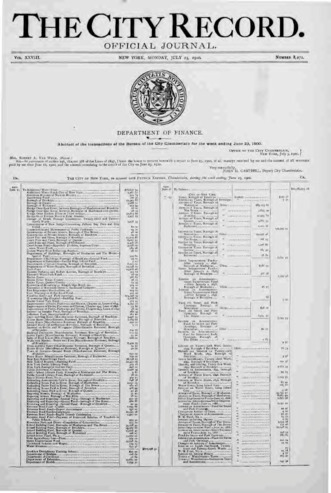 The City Record newspaper publishes notices which includes but is not limited to: public hearings and meetings, public auctions and sales, solicitations and awards and official rules proposed and adopted by city agencies. This is the City Record Newspaper for July 23, 1900.