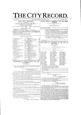 The City Record newspaper publishes notices which includes but is not limited to: public hearings and meetings, public auctions and sales, solicitations and awards and official rules proposed and adopted by city agencies. This is the City Record Newspaper for December 02, 1909.