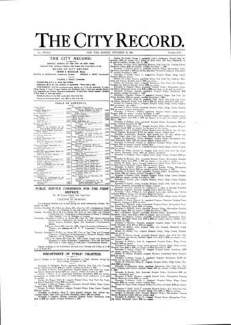 The City Record newspaper publishes notices which includes but is not limited to: public hearings and meetings, public auctions and sales, solicitations and awards and official rules proposed and adopted by city agencies. This is the City Record Newspaper for November 29, 1909.