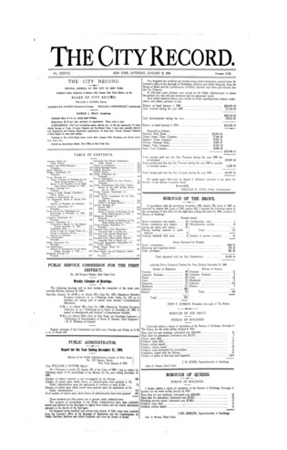 The City Record newspaper publishes notices which includes but is not limited to: public hearings and meetings, public auctions and sales, solicitations and awards and official rules proposed and adopted by city agencies. This is the City Record Newspaper for January 15, 1910.