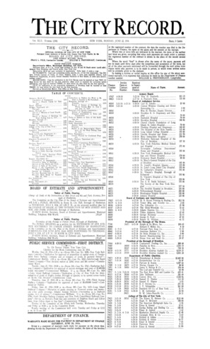 The City Record newspaper publishes notices which includes but is not limited to: public hearings and meetings, public auctions and sales, solicitations and awards and official rules proposed and adopted by city agencies. This is the City Record Newspaper for June 22, 1914.