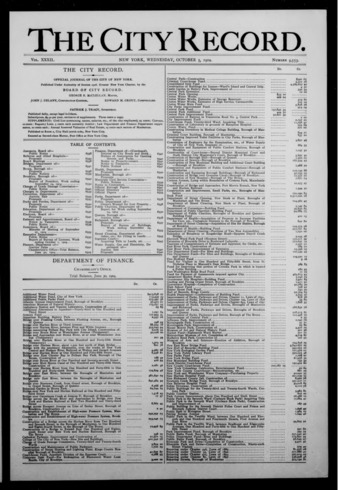 The City Record newspaper publishes notices which includes but is not limited to: public hearings and meetings, public auctions and sales, solicitations and awards and official rules proposed and adopted by city agencies. This is the City Record Newspaper for October 05, 1904.