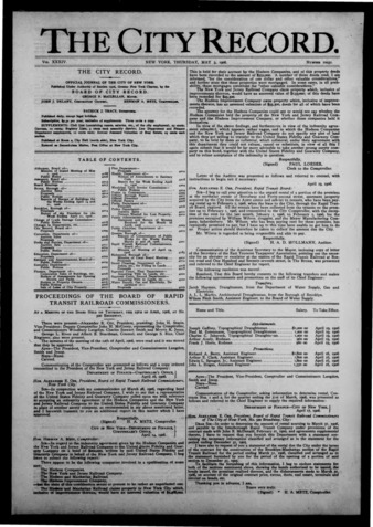 The City Record newspaper publishes notices which includes but is not limited to: public hearings and meetings, public auctions and sales, solicitations and awards and official rules proposed and adopted by city agencies. This is the City Record Newspaper for May 03, 1906.