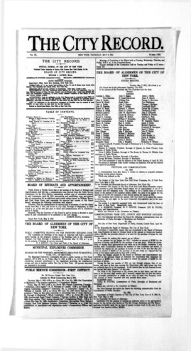 The City Record newspaper publishes notices which includes but is not limited to: public hearings and meetings, public auctions and sales, solicitations and awards and official rules proposed and adopted by city agencies. This is the City Record Newspaper for May 09, 1912.