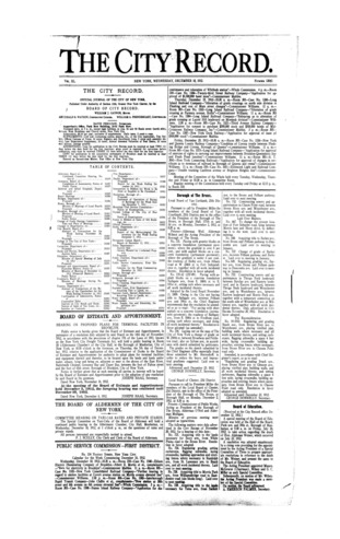 The City Record newspaper publishes notices which includes but is not limited to: public hearings and meetings, public auctions and sales, solicitations and awards and official rules proposed and adopted by city agencies. This is the City Record Newspaper for December 18, 1912.