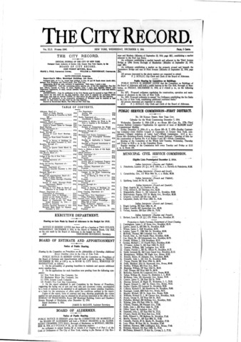 The City Record newspaper publishes notices which includes but is not limited to: public hearings and meetings, public auctions and sales, solicitations and awards and official rules proposed and adopted by city agencies. This is the City Record Newspaper for December 09, 1914.