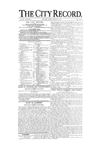 The City Record newspaper publishes notices which includes but is not limited to: public hearings and meetings, public auctions and sales, solicitations and awards and official rules proposed and adopted by city agencies. This is the City Record Newspaper for February 16, 1915.