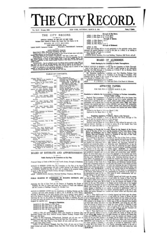 The City Record newspaper publishes notices which includes but is not limited to: public hearings and meetings, public auctions and sales, solicitations and awards and official rules proposed and adopted by city agencies. This is the City Record Newspaper for March 25, 1916.