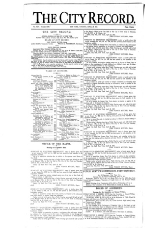 The City Record newspaper publishes notices which includes but is not limited to: public hearings and meetings, public auctions and sales, solicitations and awards and official rules proposed and adopted by city agencies. This is the City Record Newspaper for April 24, 1917.