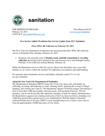 The New York City Department of Sanitation has announced that there WILL BE collection service on Presidents Day, Monday, February 20, 2023. Residents who normally receive Monday trash, curbside composting or recycling collection should place their material at the curb between 4 p.m. and midnight