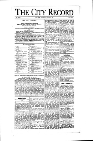 The City Record newspaper publishes notices which includes but is not limited to: public hearings and meetings, public auctions and sales, solicitations and awards and official rules proposed and adopted by city agencies. This is the City Record Newspaper for August 31, 1911.