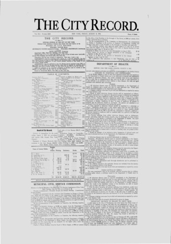 The City Record newspaper publishes notices which includes but is not limited to: public hearings and meetings, public auctions and sales, solicitations and awards and official rules proposed and adopted by city agencies. This is the City Record Newspaper for August 15, 1913.