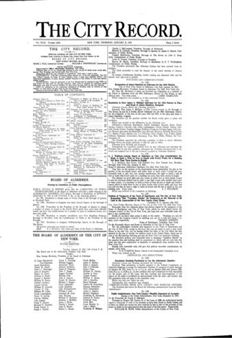 The City Record newspaper publishes notices which includes but is not limited to: public hearings and meetings, public auctions and sales, solicitations and awards and official rules proposed and adopted by city agencies. This is the City Record Newspaper for January 21, 1915.