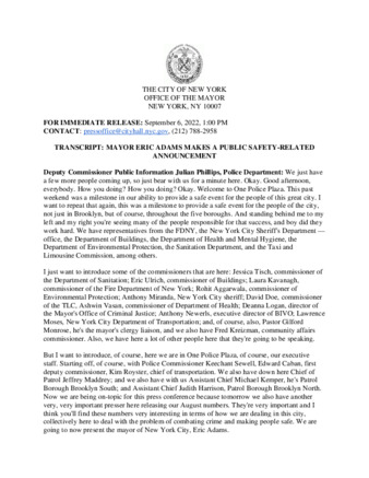 TRANSCRIPT: MAYOR ERIC ADAMS MAKES A PUBLIC SAFETY-RELATED ANNOUNCEMENT