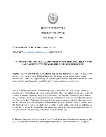 A transcript about New York City Mayor Eric Adams hosting an event to thank those who have assisted New York City in managing the asylum seeker crisis.
