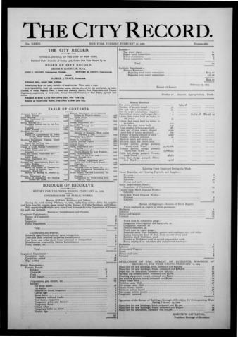 The City Record newspaper publishes notices which includes but is not limited to: public hearings and meetings, public auctions and sales, solicitations and awards and official rules proposed and adopted by city agencies. This is the City Record Newspaper for February 21, 1905.