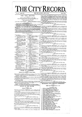 The City Record newspaper publishes notices which includes but is not limited to: public hearings and meetings, public auctions and sales, solicitations and awards and official rules proposed and adopted by city agencies. This is the City Record Newspaper for April 14, 1917.