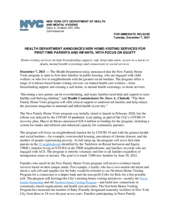 The New York City Department of Health and Mental Hygiene published this press release titled, "Health Department Announces New Home-visiting Services for First-time Parents and Infants, With Focus on Equity", on December 7, 2021.