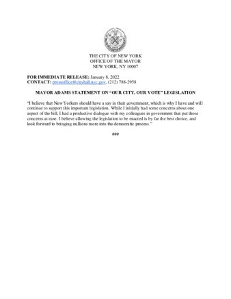 MAYOR ADAMS STATEMENT ON “OUR CITY, OUR VOTE” LEGISLATION