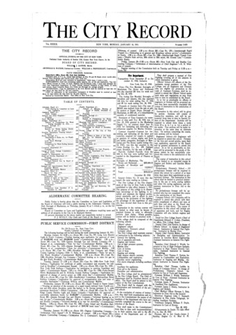 The City Record newspaper publishes notices which includes but is not limited to: public hearings and meetings, public auctions and sales, solicitations and awards and official rules proposed and adopted by city agencies. This is the City Record Newspaper for January 16, 1911.