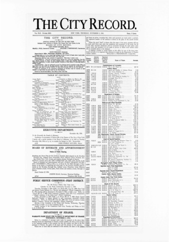 The City Record newspaper publishes notices which includes but is not limited to: public hearings and meetings, public auctions and sales, solicitations and awards and official rules proposed and adopted by city agencies. This is the City Record Newspaper for November 05, 1914.