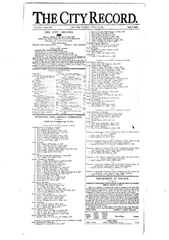 The City Record newspaper publishes notices which includes but is not limited to: public hearings and meetings, public auctions and sales, solicitations and awards and official rules proposed and adopted by city agencies. This is the City Record Newspaper for August 24, 1918.