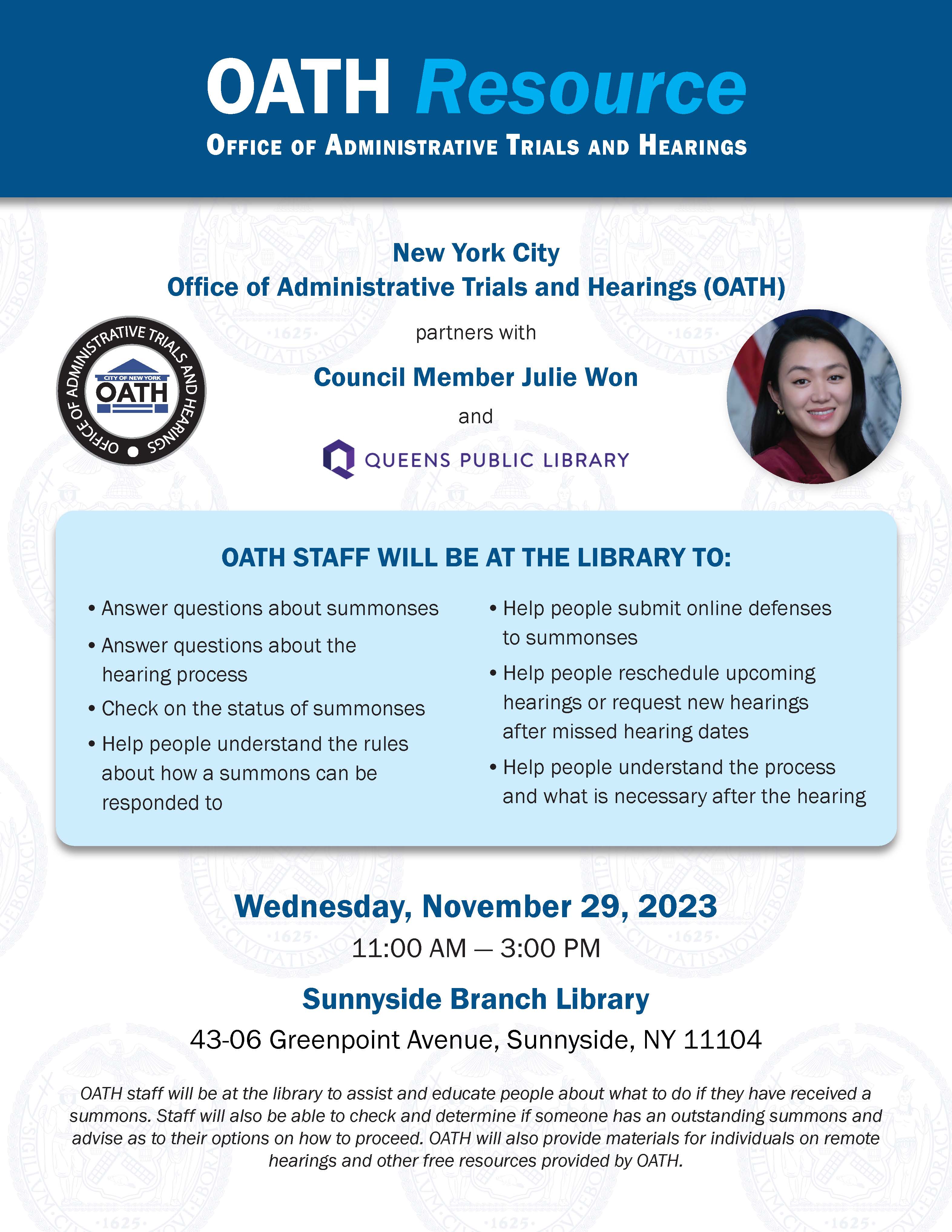 OATH staff were at the library to assist and educate people about what to do should they have received a summons and to check to determine if someone has an outstanding summons. Materials about remote hearings and other free resources were provided to the public as well.
