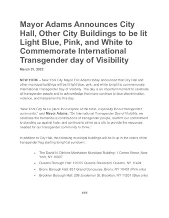 New York City Mayor Eric Adams announces that City Hall and other municipal buildings will be lit light blue, pink, and white to commemorate International Transgender Day of Visibility.