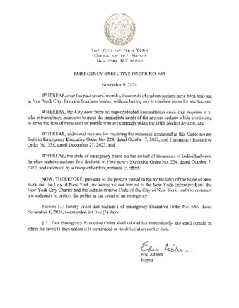 Emergency Executive Order No. 689, is being submitted to extend Emergency Executive Order No. 686, dated November 4, 2024, for five (5) days, as it relates to the state of emergency based on the arrival of thousands of individuals and families seeking asylum.