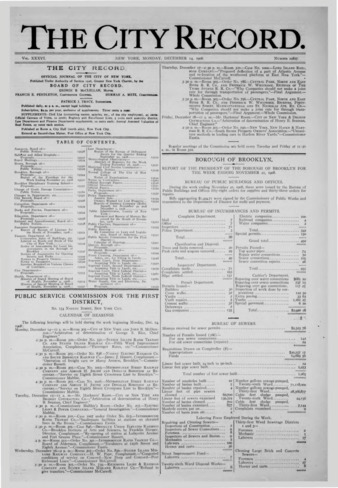 The City Record newspaper publishes notices which includes but is not limited to: public hearings and meetings, public auctions and sales, solicitations and awards and official rules proposed and adopted by city agencies. This is the City Record Newspaper for December 14, 1908.