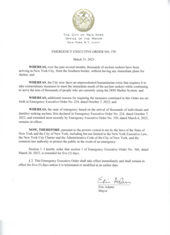 Emergency Executive Order No. 370, is being submitted to extend Emergency Executive Order No. 366, dated March 26, 2023, for five (5) days, if this relates to the state of emergency based on the arrival of thousands of individuals and families seeking asylum.