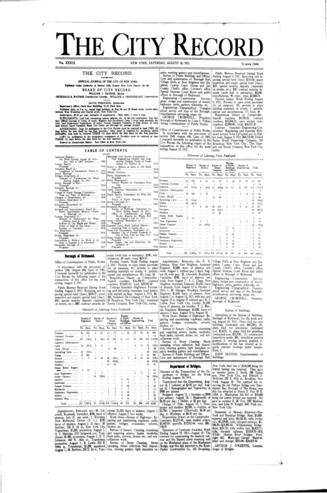 The City Record newspaper publishes notices which includes but is not limited to: public hearings and meetings, public auctions and sales, solicitations and awards and official rules proposed and adopted by city agencies. This is the City Record Newspaper for August 26, 1911.