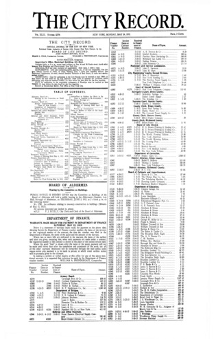 The City Record newspaper publishes notices which includes but is not limited to: public hearings and meetings, public auctions and sales, solicitations and awards and official rules proposed and adopted by city agencies. This is the City Record Newspaper for May 24, 1915.