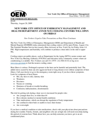 - NEW YORK CITY OFFICE OF EMERGENCY MANAGEMENT AND HEALTH DEPARTMENT ANNOUNCE COOLING CENTERS WILL OPEN ON FRIDAY