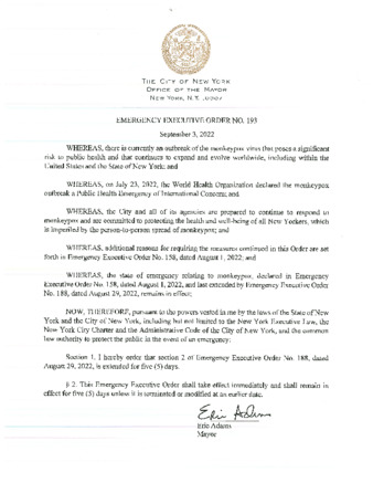 Emergency Executive Order No. 193, extends Emergency Executive Order No. 188, dated August 29, 2022, for five (5) days, if this relates to the outbreak of the monkeypox virus that poses a significant risk to public health.