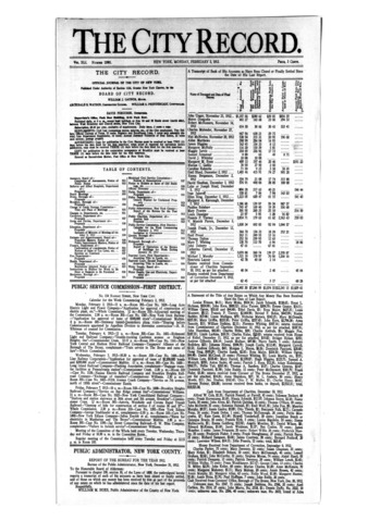 The City Record newspaper publishes notices which includes but is not limited to: public hearings and meetings, public auctions and sales, solicitations and awards and official rules proposed and adopted by city agencies. This is the City Record Newspaper for February 03, 1913.
