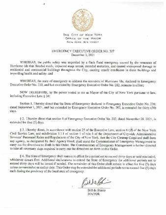 EMERGENCY EXECUTIVE ORDER NO. 307 December 3, 2021 WHEREAS, the public safety was imperiled by a flash flood emergency caused by the remnants of Hurricane Ida that flooded roads, impacted mass transit, stranded motorists, and caused widespread damage to residential and commercial buildings throug